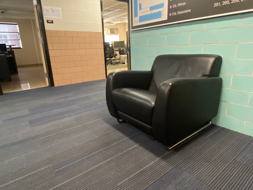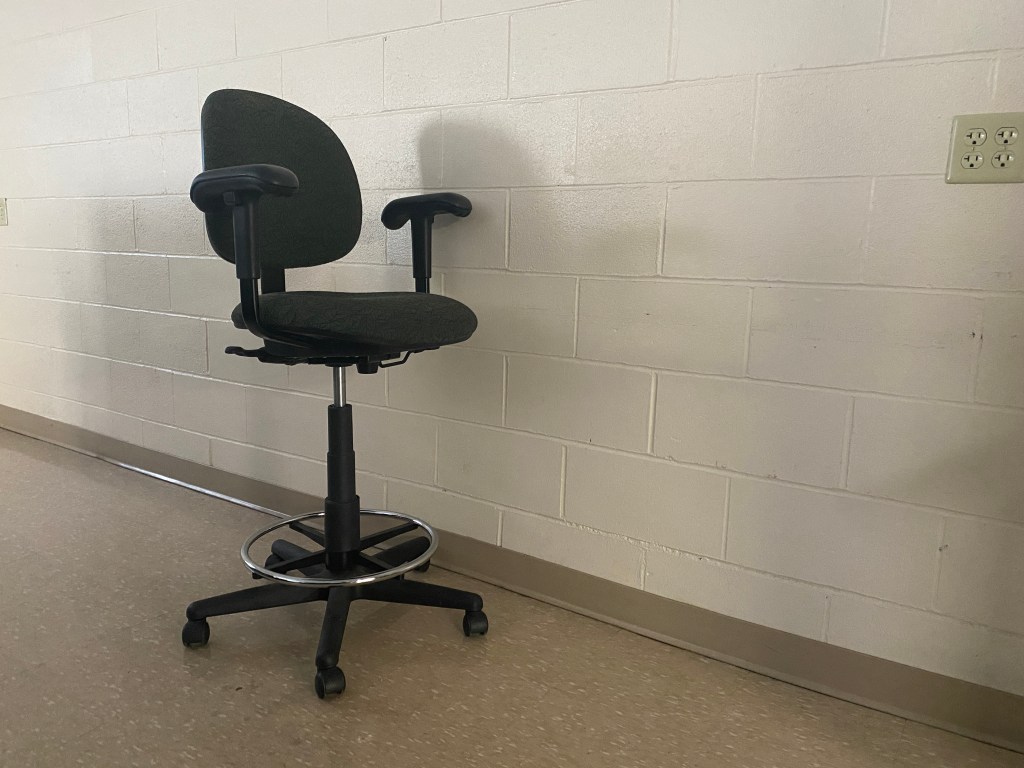 An office chair on the second floor of Blazer Dining on the University of Kentucky campus. January 23, 2025. Photo by Phoenix Stevens.A computer desk on the second floor of Blazer Dining on the University of Kentucky campus. January 23, 2025. Photo by Phoenix Stevens.An electronic scooter leaning on a computer desk on the second floor of Blazer Dining on the University of Kentucky campus. January 23, 2025. Photo by Phoenix Stevens.A fire extinguisher on the second floor of Blazer Dining on the University of Kentucky campus. January 23, 2025. Photo by Phoenix Stevens.A lounge chair on the second floor of Blazer Dining on the University of Kentucky campus. January 23, 2025. Photo by Phoenix Stevens.